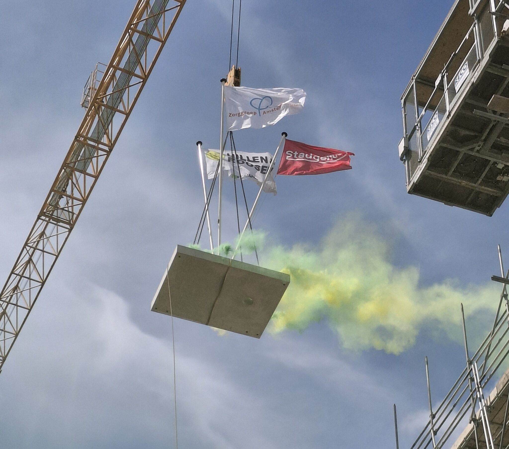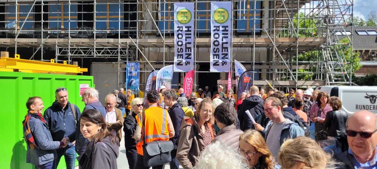 Tijd voor een feestje! Hoogste punt bereikt. Bouwbedrijf Hillen & Roosen en woningcorporatie Stadgenoot vierden dat op 26 mei 2025 met Noorderzonners en anderen.