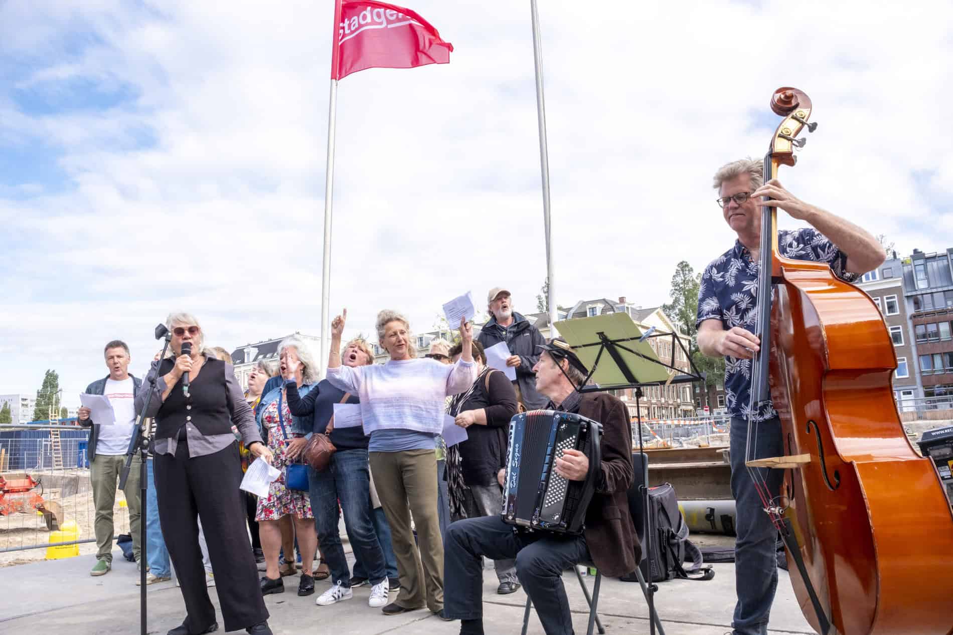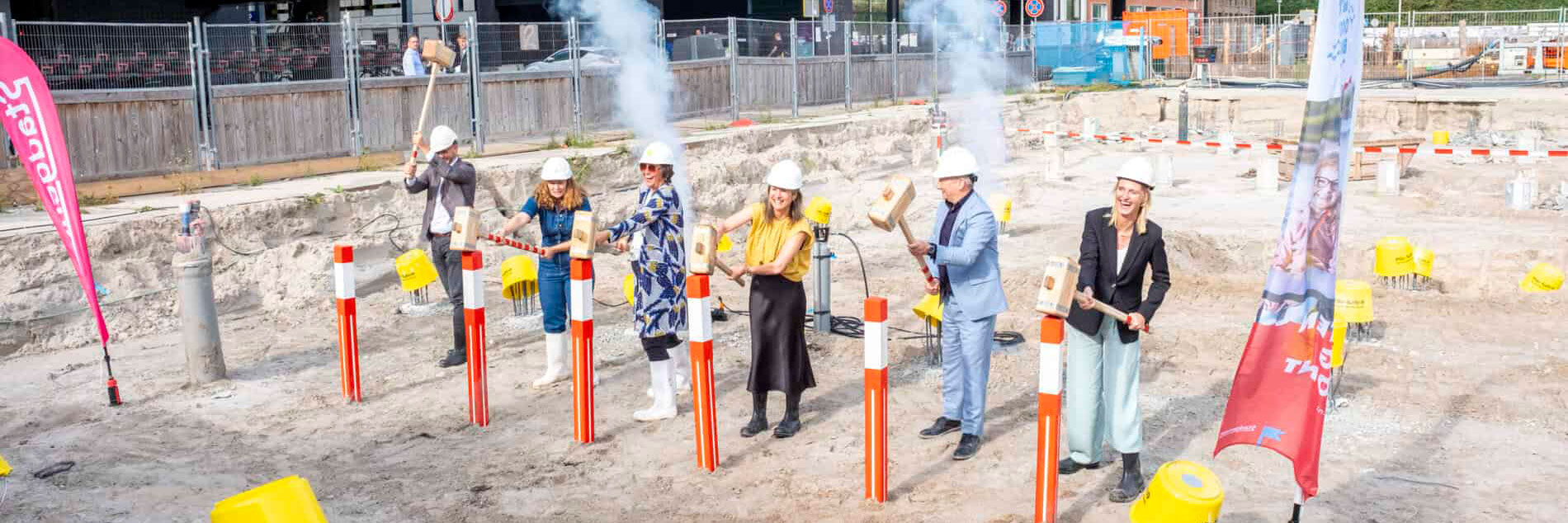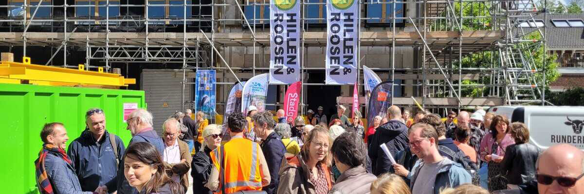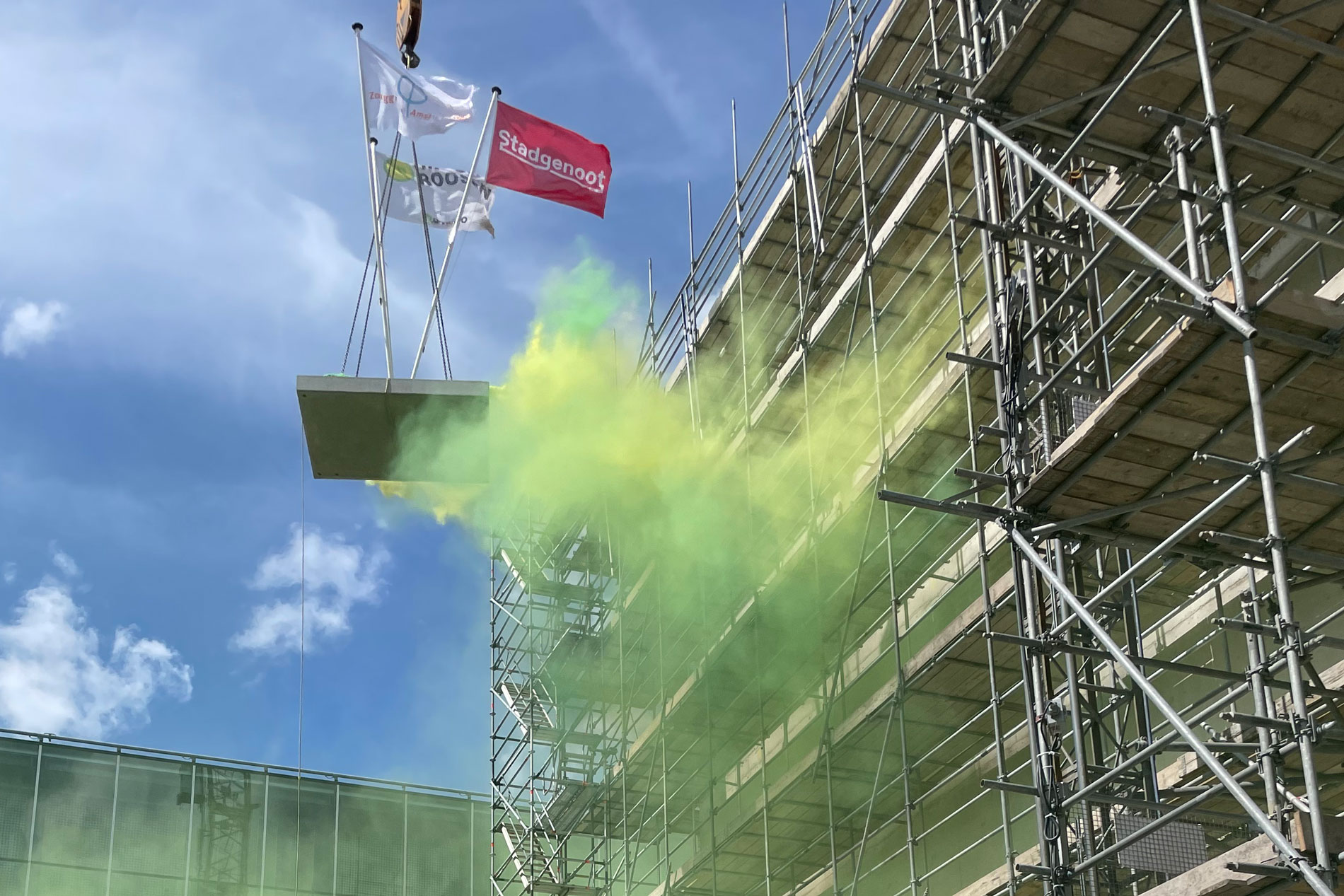 Tijd voor een feestje! Hoogste punt bereikt. Bouwbedrijf Hillen & Roosen en woningcorporatie Stadgenoot vierden dat op 26 mei 2025 met Noorderzonners en anderen. Met het leggen van een steen, een glas, een lied en een rondleiding in het pand.